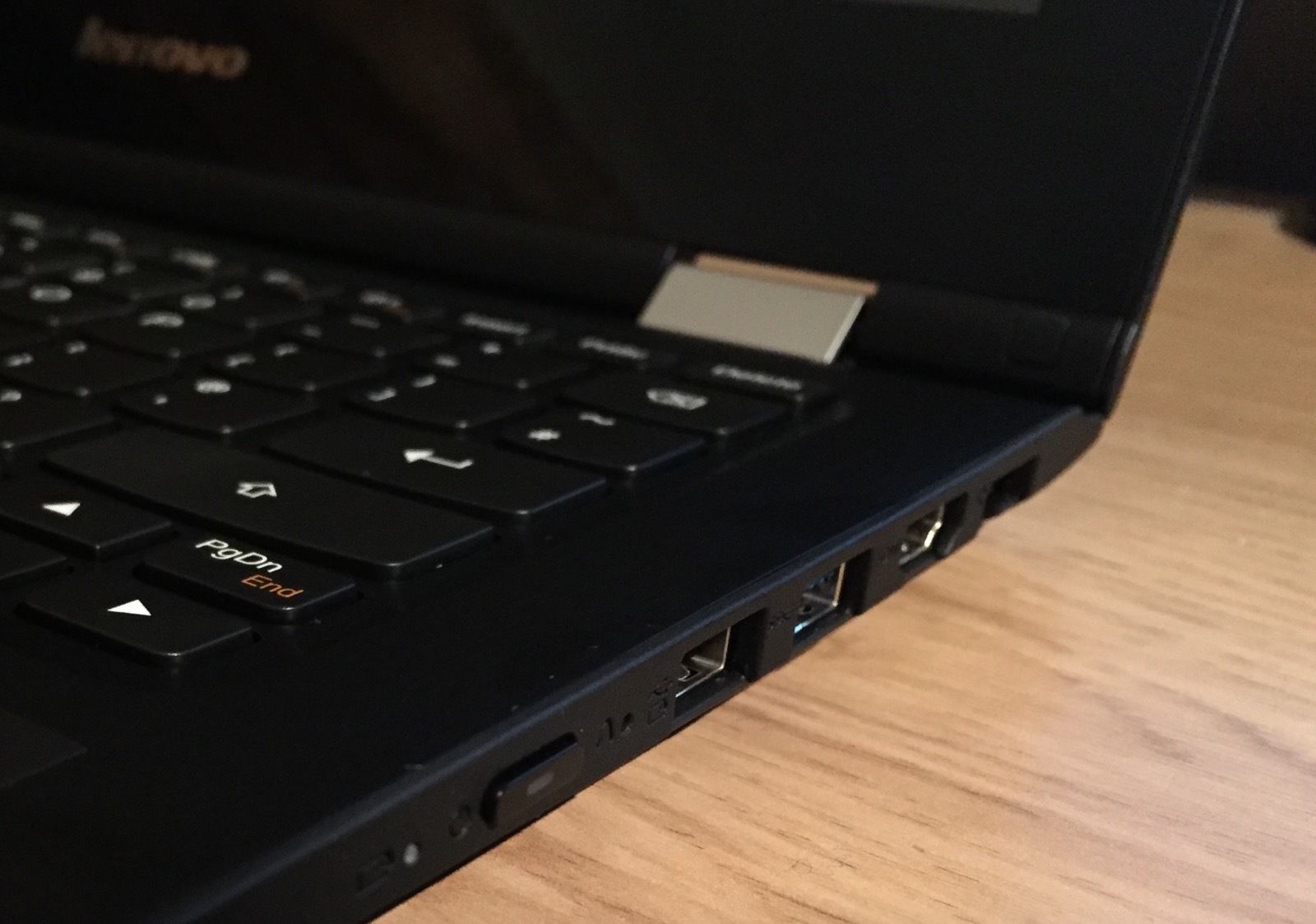 Connectivity stands out on this device with a grand total of three USB ports (consisting of 2x USB 2.0 and 1x USB 3.0), a full size HDMI connector, a collapsible gigabit Ethernet port, a full size SD card reader and a 3.5mm headphone jack. For a device that is just 14mm thin from bottom to keyboard level, this is seriously impressive. Having the USB ports is eternally useful on these portable devices – especially as one of them is what Lenovo call an “always-on” USB port, which basically means it’ll charge devices such as your mobile phone even if the computer is completely switched off (essentially acting as a portable battery bank). Furthermore, the device comes with a very well designed reversible 45W power adapter, meaning that charging from flat to full only takes around two hours and is easy to connect in low light. These small things matter!